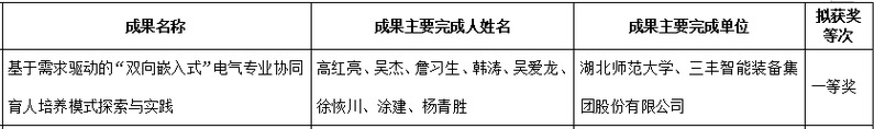 近日,从湖北省人力资源和社会保障厅和湖北省教育厅获悉,由伟德国际victor1946高红亮副教授主持的《基于需求驱动的“双向嵌入式”电气专业协同育人培养模式探索与实践》项目荣获第九届湖北省高等学校教学成果一等奖。