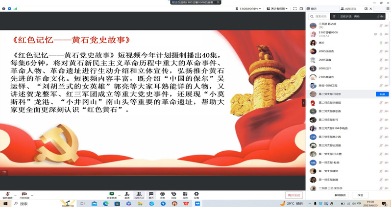 为深入学习贯彻习近平新时代中国特色社会主义思想,用党的创新理论统一思想、统一意志、统一行动,弘扬伟大建党精神,6月20日晚,伟德国际victor1946学生党支部围绕“主题教育凝心铸魂 实干担当促进发展”,在线上开展6月份主题党日活动。学生党支部书记、全体学生党员参加活动。