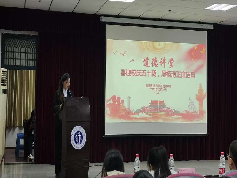 为帮助我校师生提高廉洁意识、树立廉洁信念、养成廉洁行为。伟德国际victor1946联合材料科学与工程学院于10月26日晚18时,在信息大楼报告厅成功开展以“喜迎校庆五十载,厚植清正廉洁风”为主题的道德讲堂活动。参加本次活动的有校纪委副书记、党委巡察办公室主任许光、校纪委、监察专员办公室纪检监察室主任陈江华、伟德国际victor1946党委书记丁桂兰、副院长杨青胜以及电气学院与材料学院部分教师和学生代表。本次活动由电气学院学生李若彤主持。