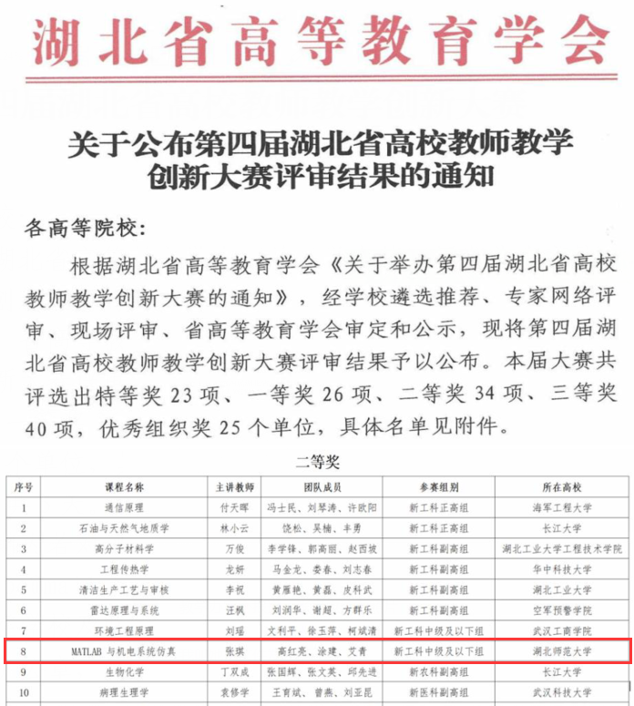 近日,由湖北省教育厅指导、湖北省高等教育学会主办、华中农业大学承办的第四届湖北省高校教师教学创新大赛圆满落幕,伟德国际victor1946教师张琪团队的《MATLAB与机电系统仿真》课程荣获新工科中级及以下组二等奖。