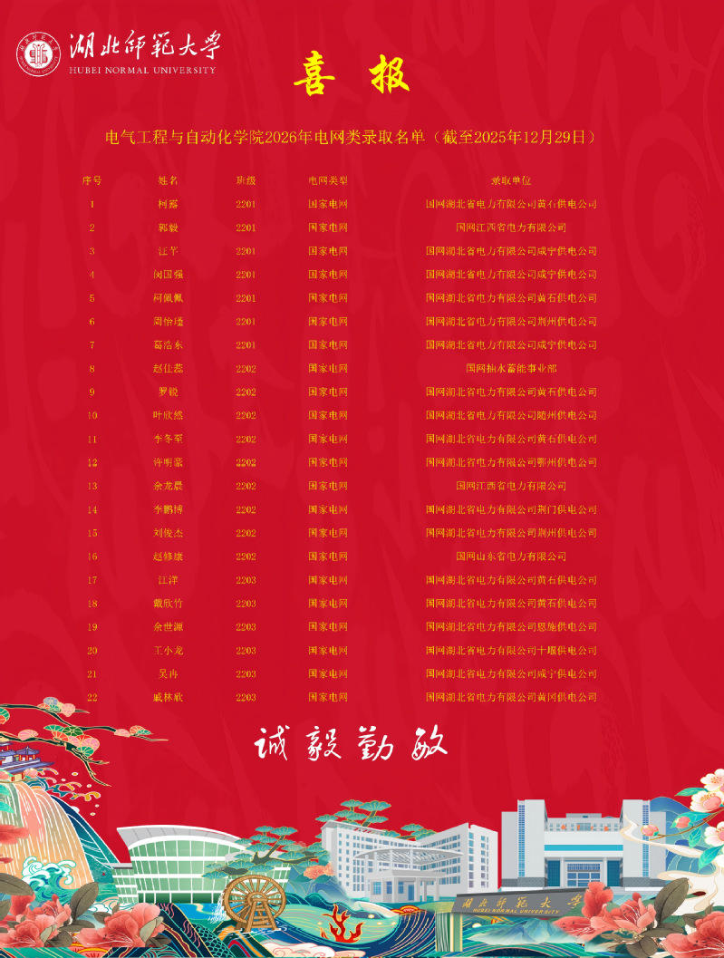 近日,随着国家电网各下属公司2026届高校毕业生考试招录结果陆续揭晓,伟德国际victor1946毕业生在电网类国企招聘中再创辉煌。本次学院共有22名毕业生成功斩获电网类国企录用资格,其中18人签约国网湖北省电力有限公司,两类录用人数均刷新历史纪录,为学院毕业生高质量就业工作再添浓墨重彩的一笔,彰显出学院人才培养与就业工作的扎实成效。